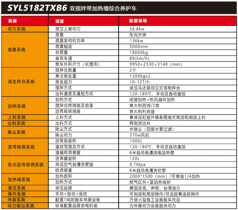 SYL5182TXB6 雙攪拌帶加熱墻路面綜合養(yǎng)護(hù)車是一款集現(xiàn)場生產(chǎn)新瀝青混合料、瀝 青路面冷料、? 舊料、銑刨料 100%現(xiàn)場加熱再生利用 ,熱瀝青灑布、裂紋跟蹤灌縫、乳化 瀝青噴灑、為其他裝置提供電力和液壓動力等多種功能于一體的瀝青路面熱再生綜合養(yǎng)護(hù) 車。配置智能燃?xì)饧t外線加熱墻 ,可輕松對路面進(jìn)行全方位加熱 ,可實現(xiàn)多場合、多路面 的各種類養(yǎng)護(hù)作業(yè)。養(yǎng)護(hù)修補費用低 ,作業(yè)快捷 ,高效率、節(jié)能環(huán)保性能突出等特點。主要適用于多種路況的中大施工量和高速公路的修補施工。